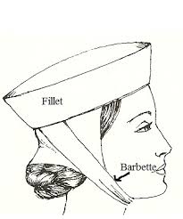the barbette was often worn with a fillet (image down below) a type of hat that looked similar to a fabric crown, with some examples of it being quite tall. they were also often used with a straw hat, an easy piece of Head wear to create, usually used by people out in the sun all day as a way of keeping cool.